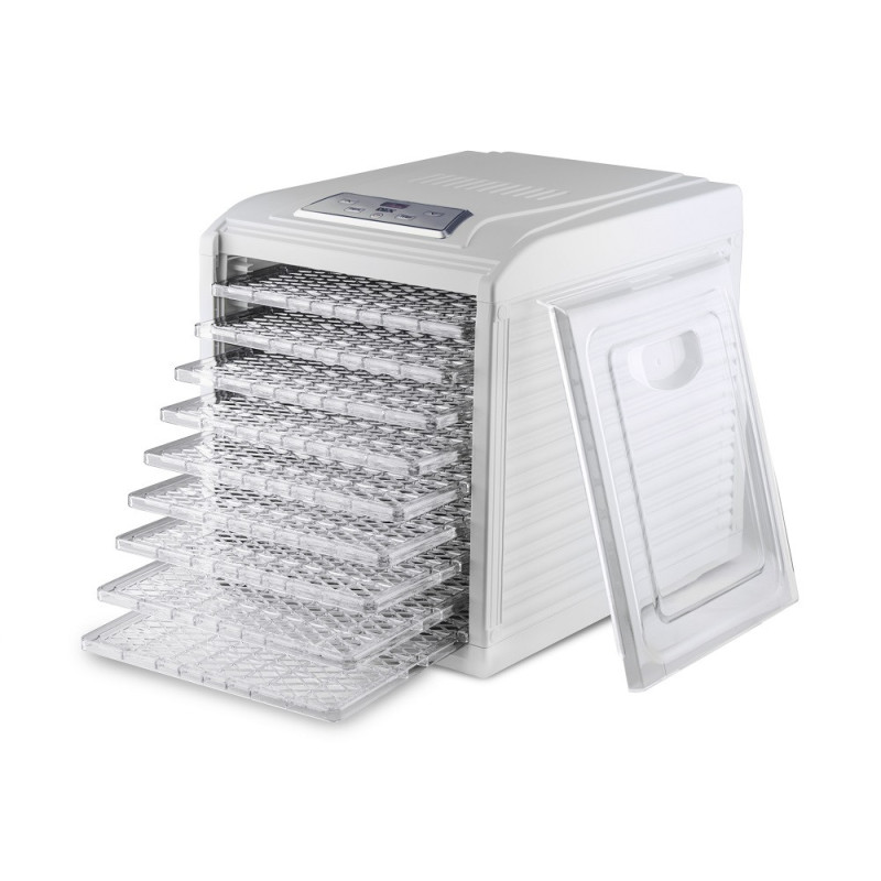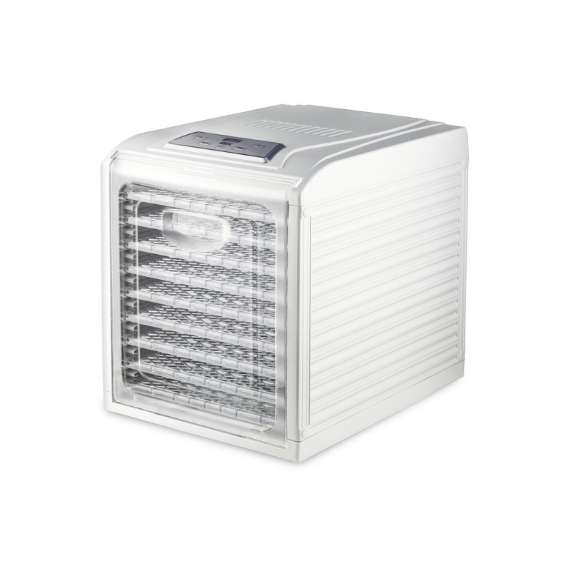 8 температурных режимов от 35°С до 70°С позволят выбрать оптимальный режим для разных типов продуктов для того, чтобы добиться желаемой степени их дегидратации и при этом максимально сохранить пищевые и полезные свойства. С помощью электронного управления и светодиодного дисплея очень просто установить необходимое время и температуру, и при необходимости корректировать настройки во время процесса сушки продуктов. А цифровой таймер на 19 часов 30 минут (шаг 30 мин) с автовыключением и звуковым сигналом позволит контролировать своевременное отключение сушилки. За процессом дегидратации продуктов можно наблюдать через прозрачную дверцу, без открытия сушилки.