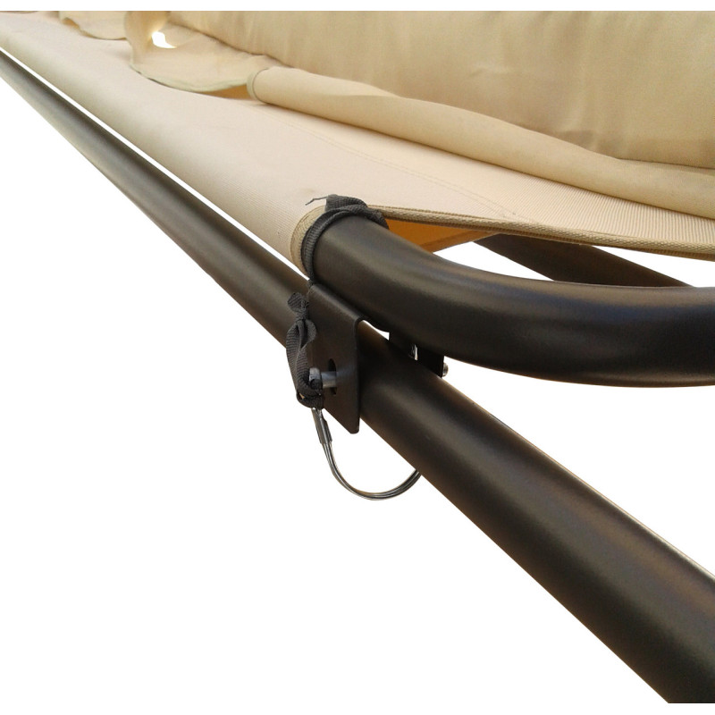 Нагрузка 250 кг позволит комфортно отдохнуть 3-м людям сидя или 2-м людям лёжа. Каркас изготовлен из стали, обшивка сидений и крыши полиэстер.