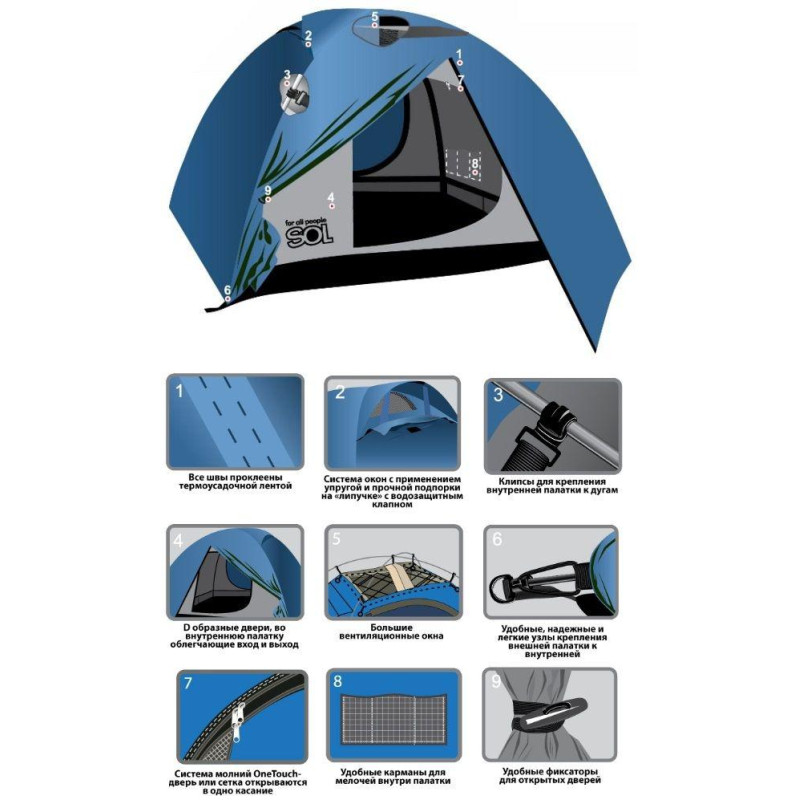 Однокомнатная трехместная кемпинговая палатка SOL ANCHOR 4. Просторный высокий тамбур с 2 входами и смотровым окном в торцевой стенке. Внешние дуги позволяют комфортно ставить и собирать палатку во время дождя, а так же использовать ее как отдельный павильон, кают-компанию или кухню.
