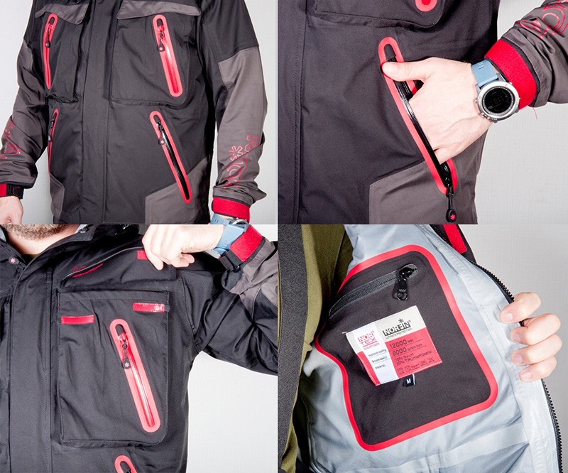 Куртка имеет шесть внешних карманов, четыре из которых на влагозащитных молниях YKK, и два объемных нагрудных кармана с клапанами на липучках «Velcro». А так же один вклеенный внутренний карман для документов и мобильного телефона.