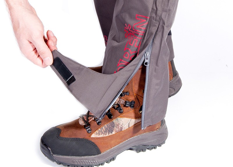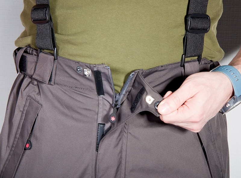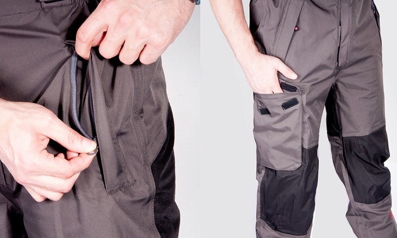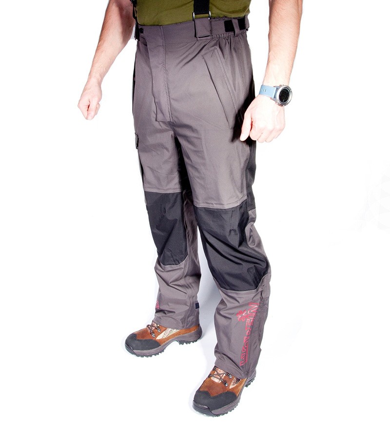 Имеют усиленные вставки мембранного материала в зонах, подверженных протеканию - на коленях и области поясницы. В поясе реализованы эластичные вставки, а так же регулировка объема талии с помощью липучек «Velcro».