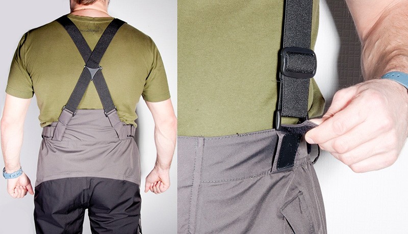 Для комфорта в использовании, а так же для защиты области поясницы от ветра,штаны выполнены в форме полукомбинезона, с регулируемыми эластичными лямками. При необходимости лямки можно отстегнуть.
