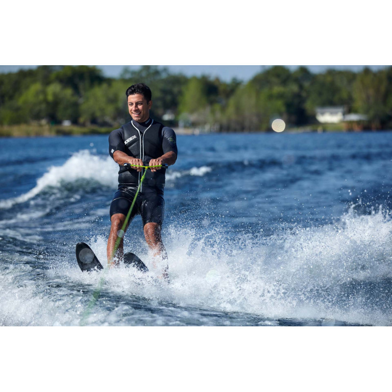 Этот набор включает всё что нужно для катания на водных лыжах. Сами лыжи выполнены из сверхпрочного и очень лёгкого материала, что позволяет маневрировать на большой скорости без особых усилий. В комплекте также присутствует фирменный спасательный жилет Jobe для защиты от удар об воду и поддержки на воде. Фал(трос) с рукояткой для крепления к буксирующему транспорту и аварийные флажки. Для удобной переноски или перевозки набора в комплекте предусмотрена сумка, в которую всё компактно складывается.