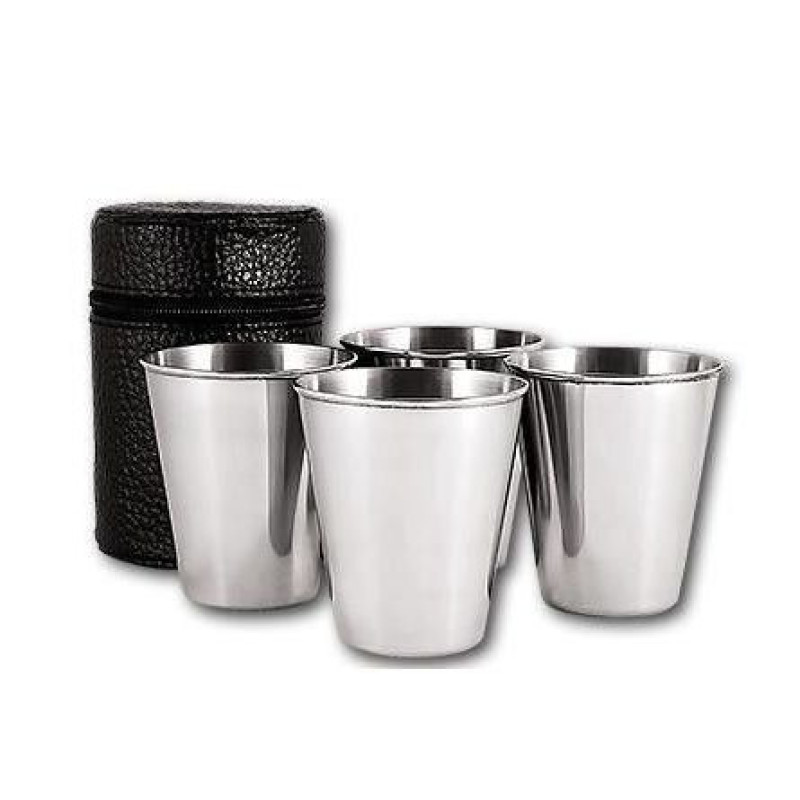 Набор состоит из 4 стаканов объёмом по 140 мл каждый. Материал стаканов, пищевая нержавеющая сталь. Она очень лёгкая и не примерзает к губам при использовании в холодное время. Этот материал не окисляется и является антибактериальным.