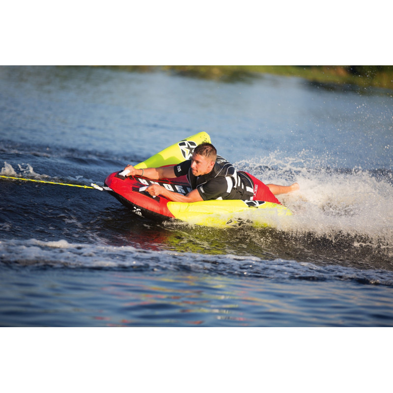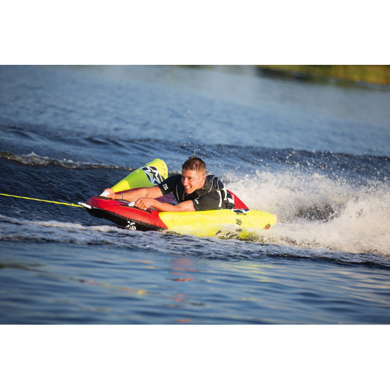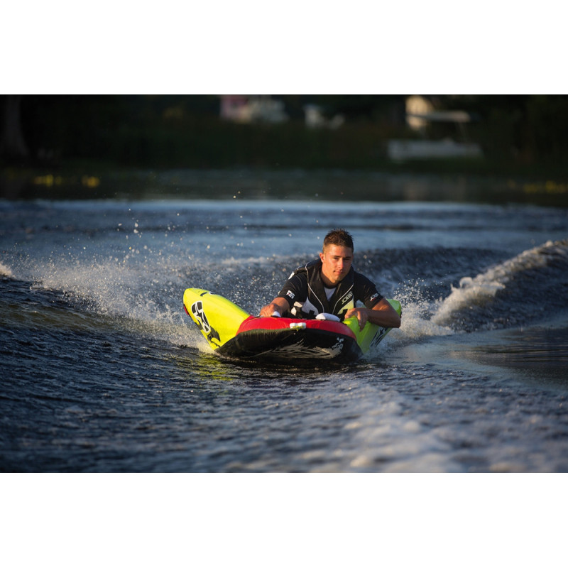 Управлять им можно по принципу зимних саней, с помощью наклонов. У этого аттракциона 3-и положения: стоя, сидя и лёжа. Сам аттракцион выполнен из высококачественного и сверхпрочного материала. Поверхность аттракциона покрыта анти скользящим материалом, который предотвращает повреждения кожи при катании. Ручки сделаны из пены обтянутые неопреном для защиты кистей от повреждений. Для дополнительной защиты аттракцион покрыт защитным чехлом. Это предотвратит от повреждений когда он не вводе. Этот аттракцион не требует большой мощности мотора или буксировочного транспорта, поэтому подойдёт для каждого владельца моторной лодки.
