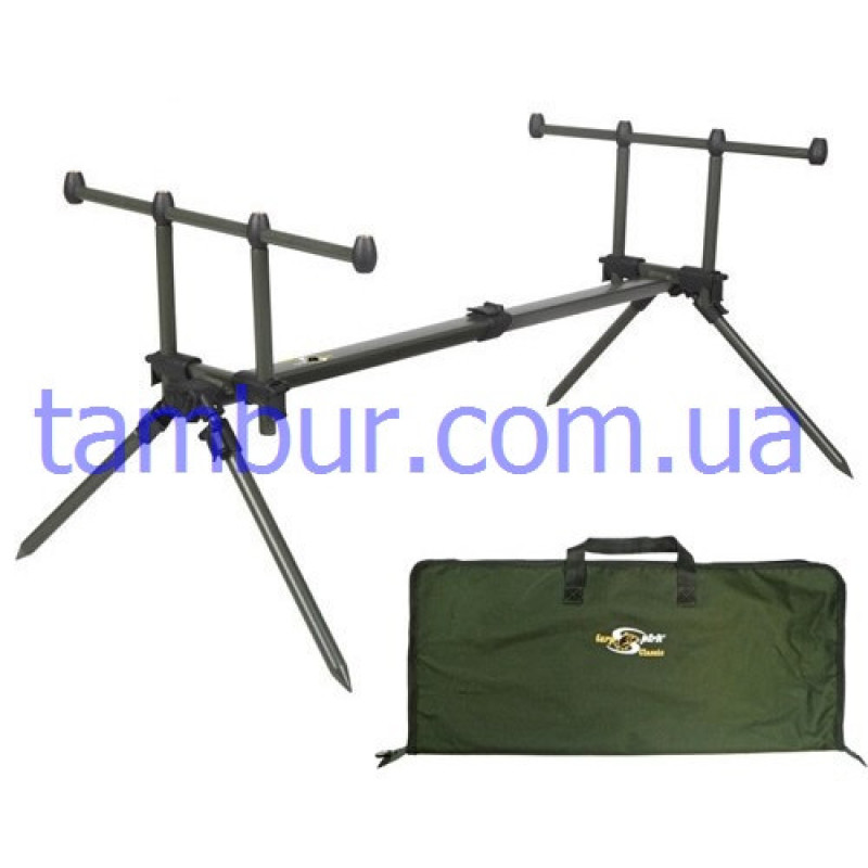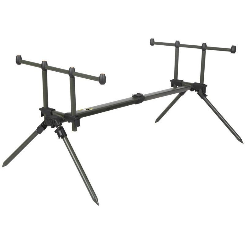 Устойчивый род-под из биалюминиевого сплава. Крепкая продольная станина с телескопической регулировкой и надёжная крепёжная гарнитура всех соединений обеспечивает достаточную стабильность и прочность конструкции. Раздельно регулируемые и съемные ноги позволяют установить род-под в самых различных вариантах и на неровных поверхностях, заостренные П-образные стойки (буз-бар) можно использовать отдельно, втыкая в грунт. В сложенном виде компактен и удобен для перевозки. Поставляется в чехле-сумке в версиях на 4 удилища. Благодаря применению алюминия и хорошо продуманной конструкции вес род-подов всего 1.80кг