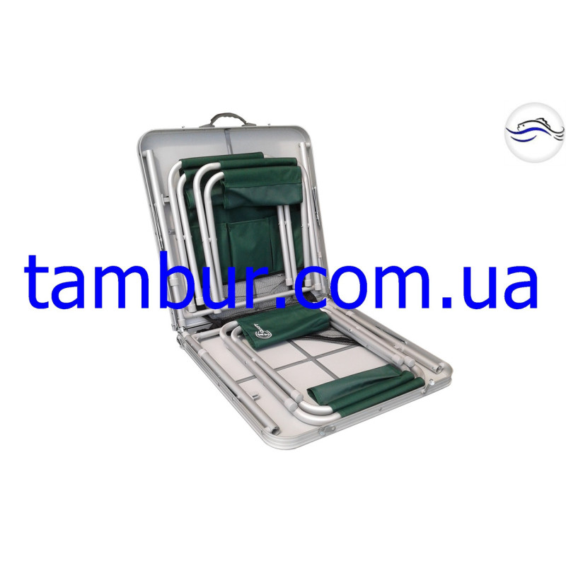 В состав комплекта входит стол и четыре стула,сетка для хранения продуктов, три кармана с боку сетки.