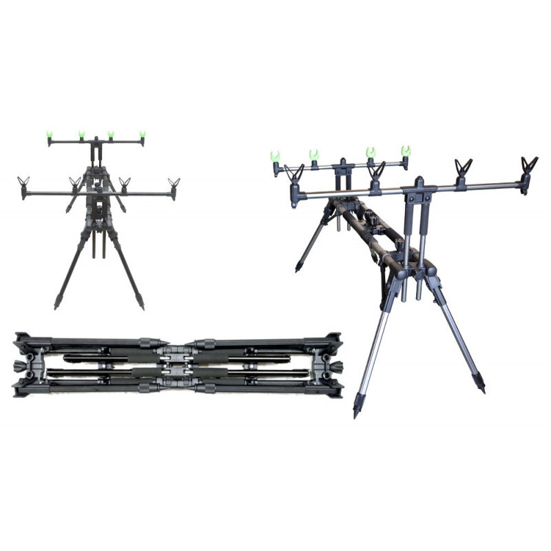 Род-под из алюминиевого сплава на 4 удилища.Особая конструкция несьемных ног и П-образных стоек (буз-бар) , позволяют установить род-под за минимальное время. Крепкая продольная двойная рама с телескопической , двухсторонней регулировкой. Усиленная крепёжная гарнитура всех соединений обеспечивает высокую стабильность и прочность конструкции. Раздельно регулируемые ноги позволяют установить род-под в самых различных вариантах и на неровных поверхностях. В сложенном виде компактен и удобен для перевозки. Благодаря применению алюминия и хорошо продуманной конструкции, вес род-пода при его надежности и мощности всего 3,2 кг.