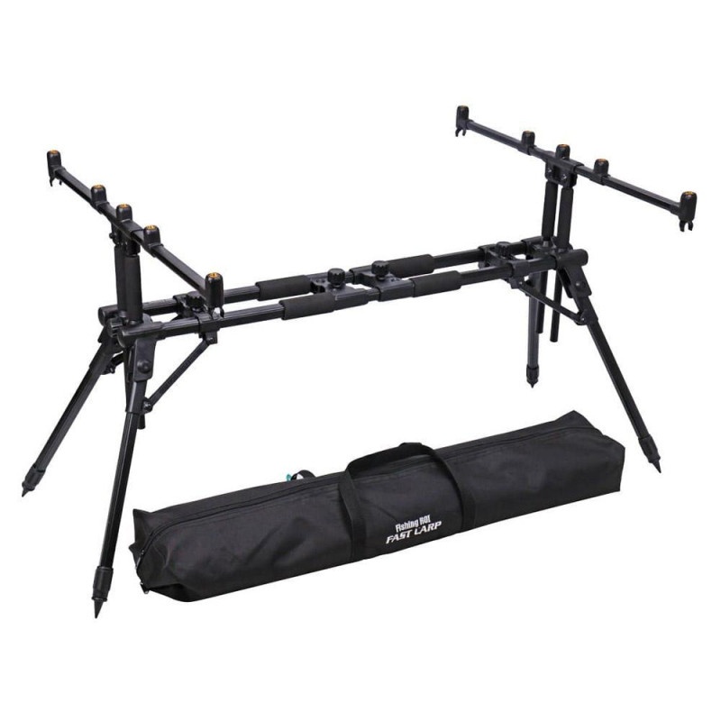 Род-под из алюминиевого сплава на 4 удилища.Особая конструкция несьемных ног и П-образных стоек (буз-бар) , позволяют установить род-под за минимальное время. Крепкая продольная двойная рама с телескопической , двухсторонней регулировкой. Усиленная крепёжная гарнитура всех соединений обеспечивает высокую стабильность и прочность конструкции. Раздельно регулируемые ноги позволяют установить род-под в самых различных вариантах и на неровных поверхностях. В сложенном виде компактен и удобен для перевозки. Благодаря применению алюминия и хорошо продуманной конструкции, вес род-пода при его надежности и мощности всего 3,2 кг.