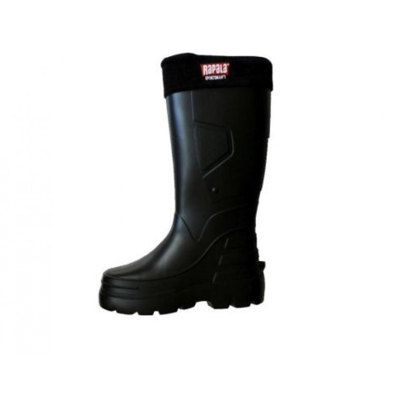 Очень лёгкие рыбацкие сапоги из эластичного материала "ЭВА". Этот материал обладает очень лёгким весом, хорошей гибкостью и на него не намерзает лёд. Оба сапога весят чуть меньше 500г и на подошве анти-скользящее покрытие и очень глубоким протектором, что предотвратит падения на льду. Фирма "RAPALA" не доверяет производство своей продукции китайским заводам. Поэтому сапоги сделаны в Польше, тем самым подтверждают качество товара. У этих сапог вставка из тинсулейта, для отвода влаги(Ваши ноги будут всегда сухими даже при интенсивных нагрузках). Он легко достаётся для просушки или стирки. Сапоги расчитаны на мороз до -30°С при движении. Эти сапоги отлично подойдут для весенней, осенней и зимней рыбалки. Т.к владыш можно достать и использовать сапоги на более тёплую погоду.
