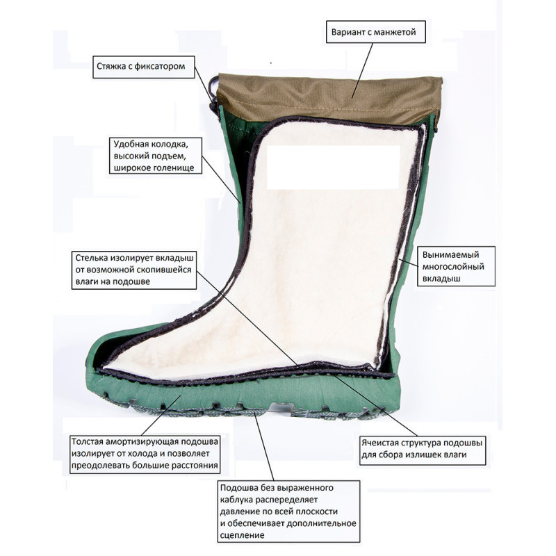 Модель изготовлена из высококачественного материала EVA и дополнительно оснащена пятислойным термо вкладышем, обеспечивающим качественную термоизоляцию ног. При этом для большего комфорта носки и износостойкости специалисты Norfin, создали внешнюю поверхность подкладки из металлизированной перфорированной фольги, а внутреннюю скомбинировали из искусственного меха и натуральную овечьей шерсти.