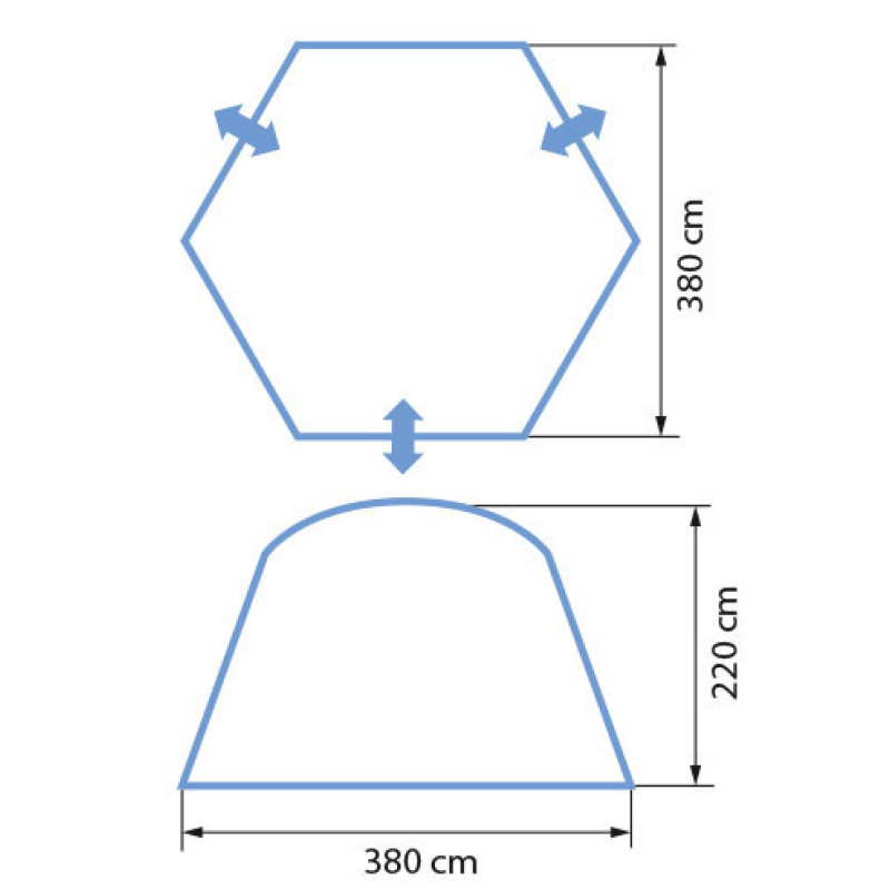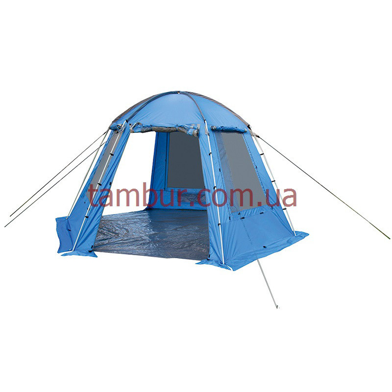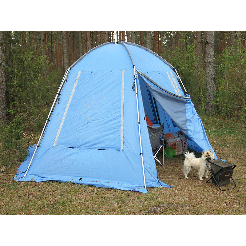 Большой экспедиционный каркасный тент-шатер. Ветроустойчивая шестигранная форма. Три входа. Стенки из антимоскитной сетки защищены от дождя, убирающимися в случае необходимости, шторами. Ветрозащитная юбка. Съемный пол в тамбуре. Каркас выполнен из усиленного стального корпуса. Возможность установки дополнительного навеса над входом.